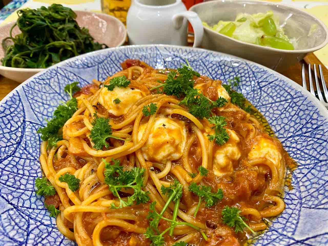 …だったので大好きパスタのトマトソースのモッツァレッラ入り🤗。