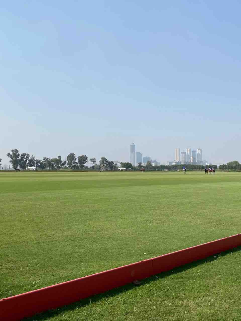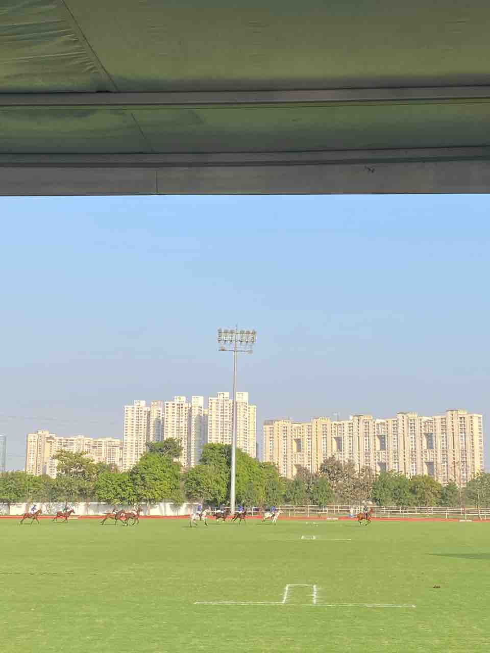 フィールドからノイダのビル群を臨む。