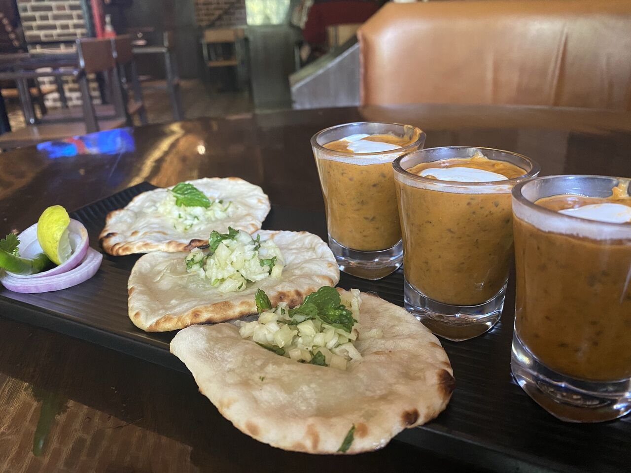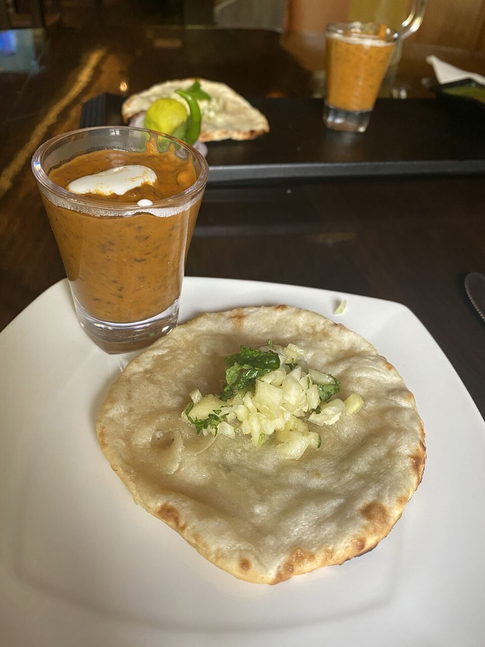ピッツァの上にこのダールをかけるか、ダールにピッツァをチョンチョンとつけて食べるかは自由。コリアンダーの辛いソース(撮り忘れ💦)をちょこちょこつけても楽しい。