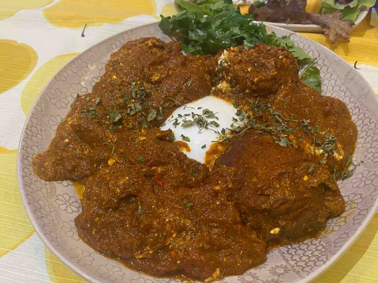 この、ハンバーグみたいなの、コフタと言って、インドの代表野菜ロウキー(夕顔の実)でできたベジタリアンお団子です。