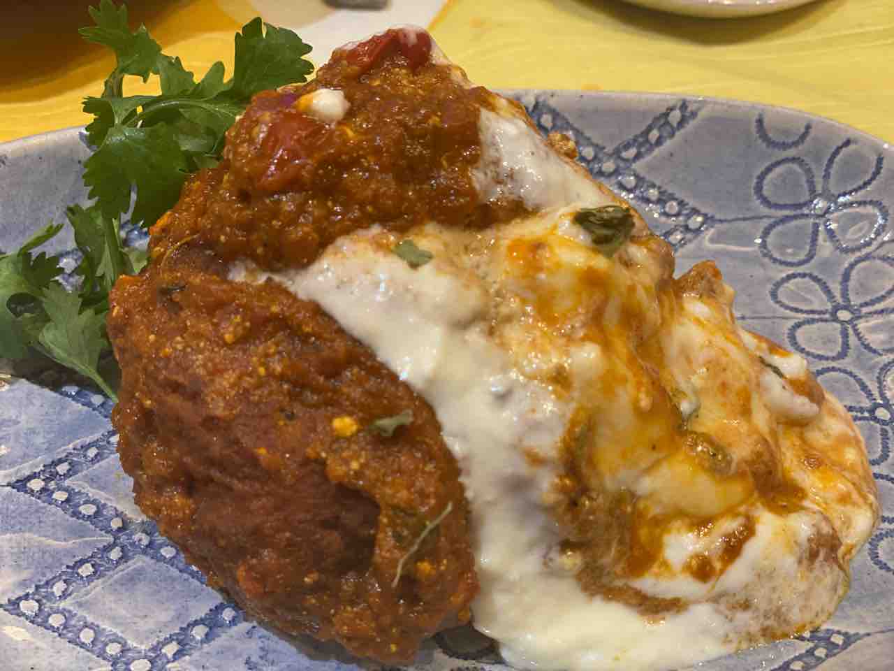 ロウキーコフタ(夕顔の実・揚げ団子)のブッラータ寄せ。