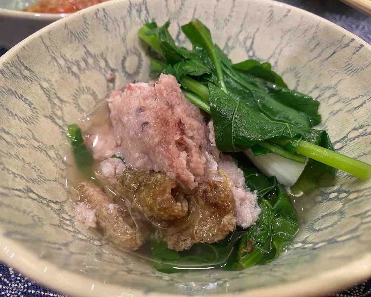 コクをだすために、脂出ししてカリカリにした鶏皮が入っています。