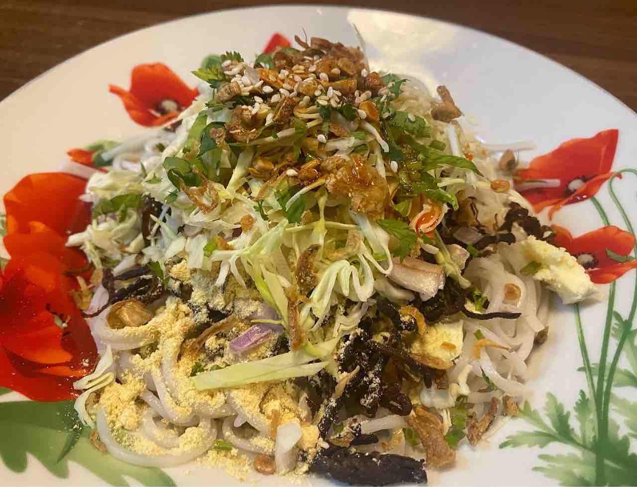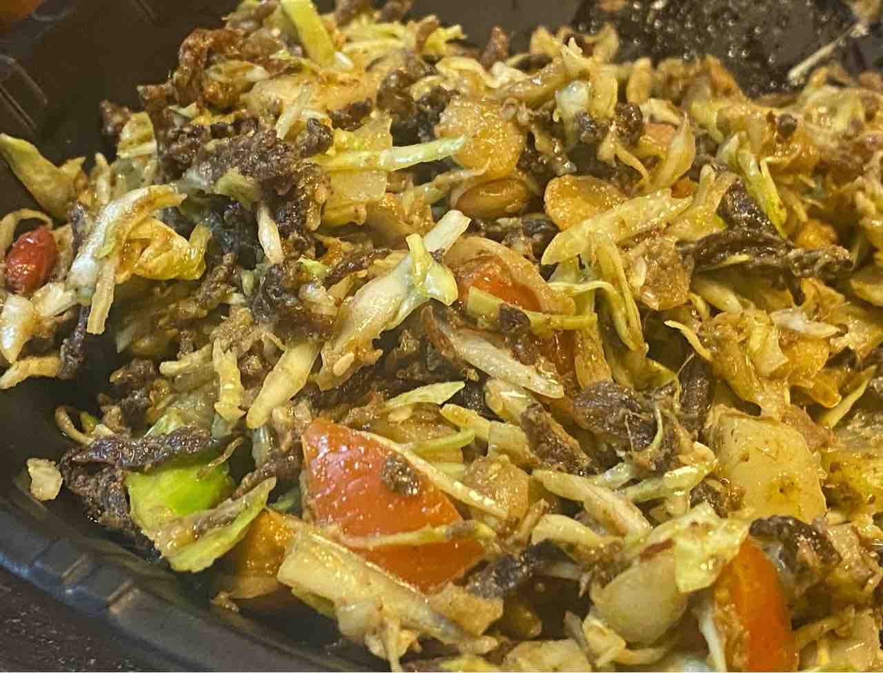 発酵したお茶を、キャベツ、トマトなどの野菜や、薄く切ったナッツと和えて頂く美味しいサラダです。