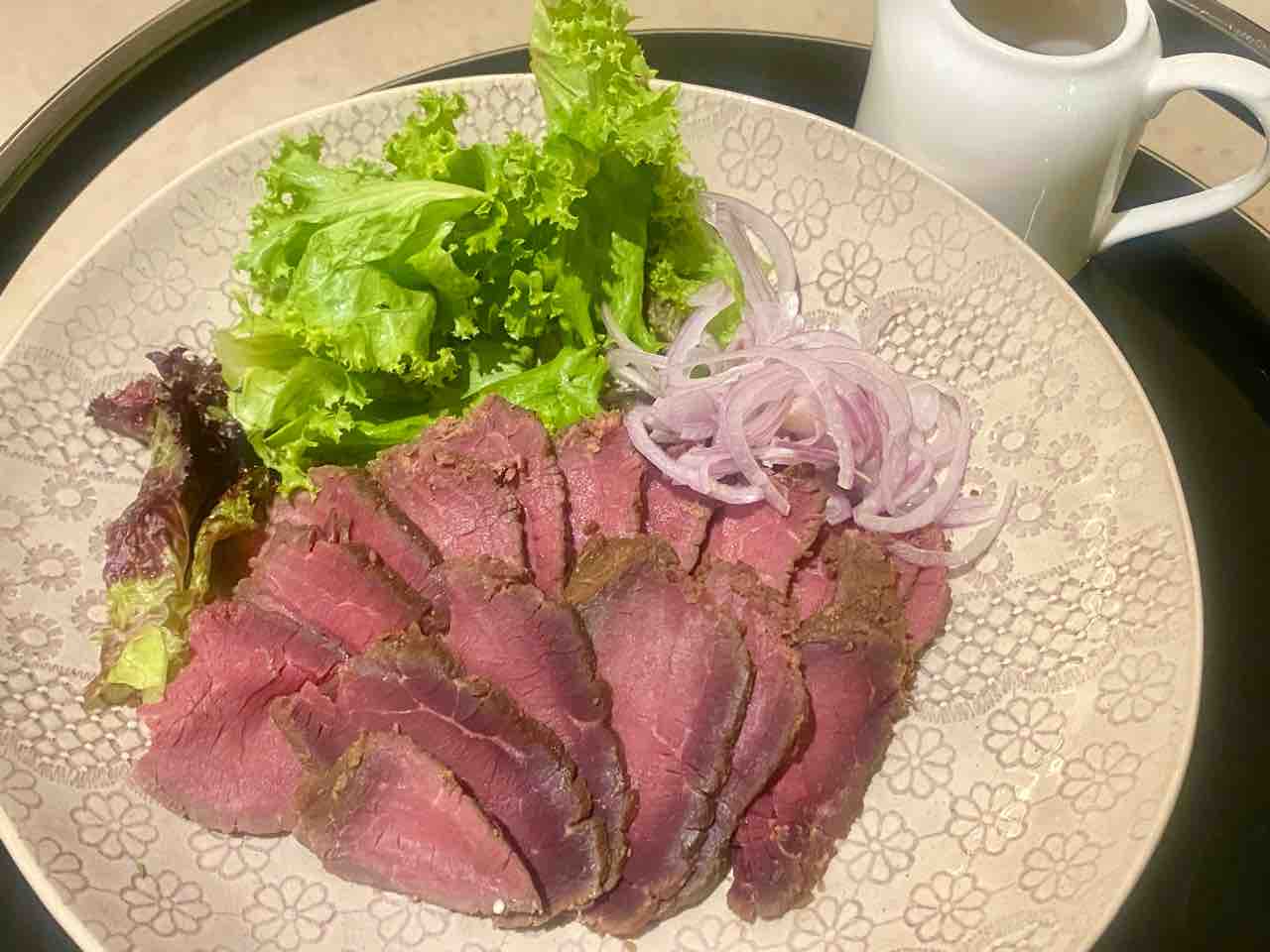 昨年だったか…🤔、お友だちがくれたバフのヒレ塊が、冷凍庫から出てきたので、ローストバフ。