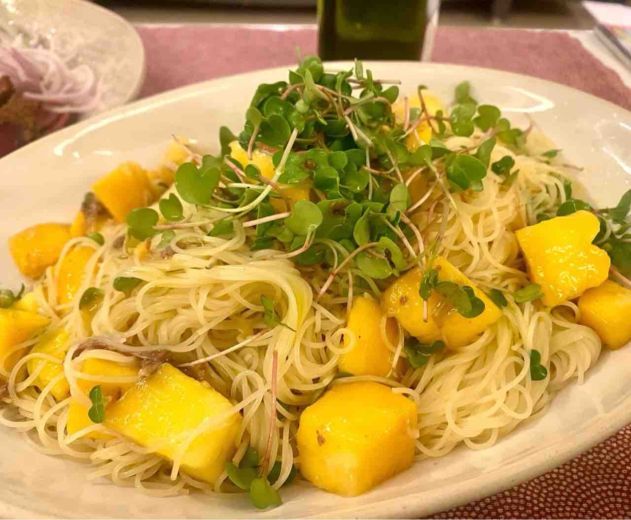できたマンゴー入りソースにニンブー1を搾り、オリーブ油、冷パスタ投入、まぜまぜ ~で出来上がり。