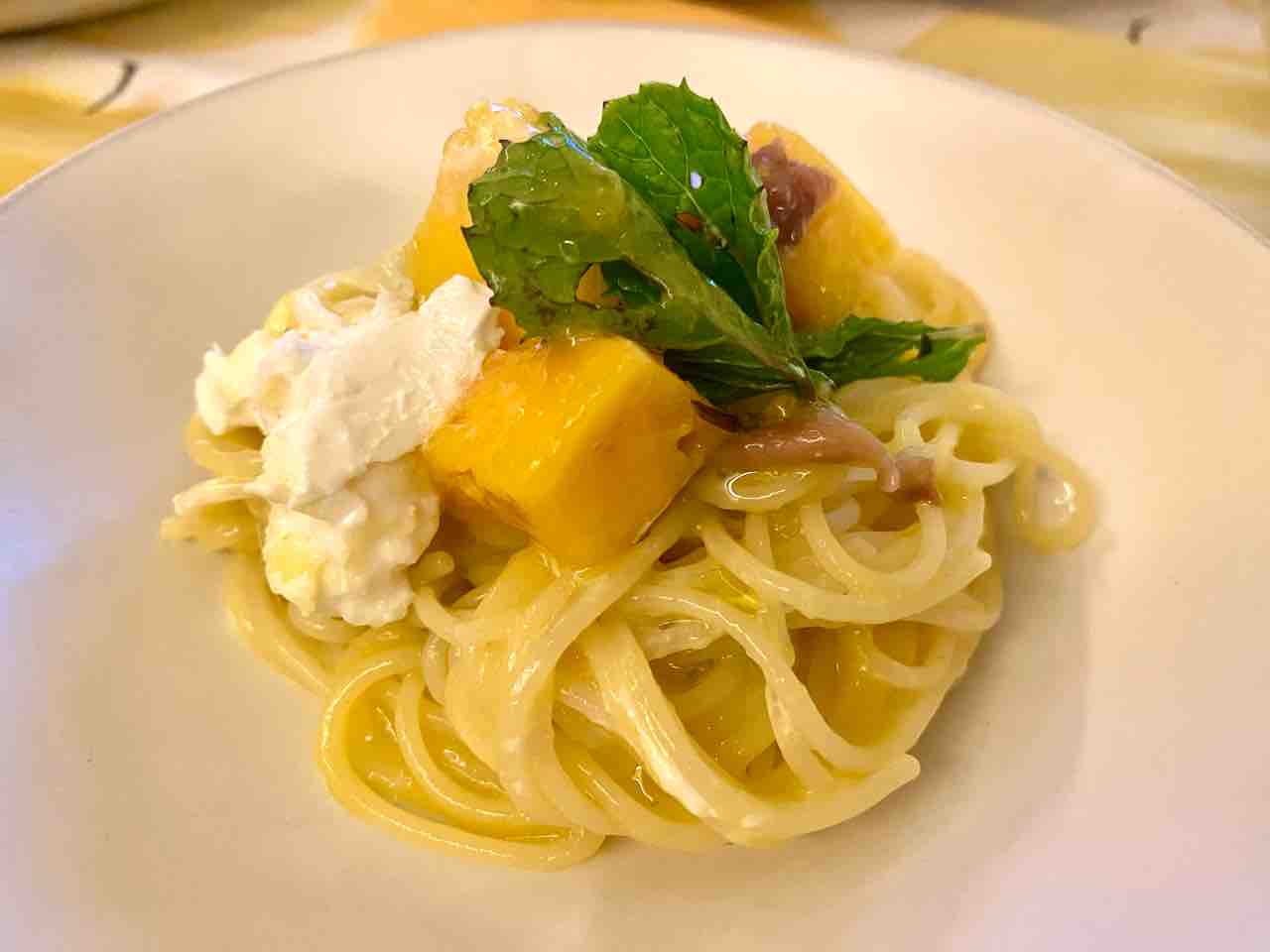 今年の私のヒット、マンゴーのガスパチョをソースにしてフェデリーニを絡めました。ソースには塩味のアクセントとしてアンチョビが入っています。この酸味塩味ソースのおかげで、ゴロッと切ったマンゴーがですね、
