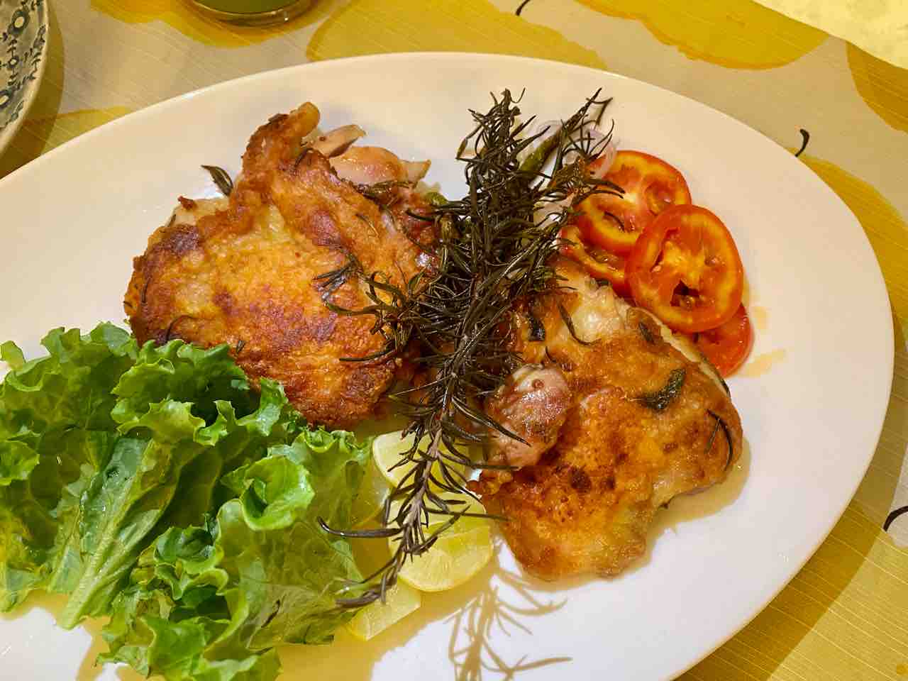 皮目をじっくり焼いてカリカリにし、できる限り脂を落としました。使った調味料は、塩とローズマリーのみ。自身の脂でカリカリに揚がるほど油が出たから、かなりカロリーオフした、高タンパク低脂質皿と思いたい🙏。
