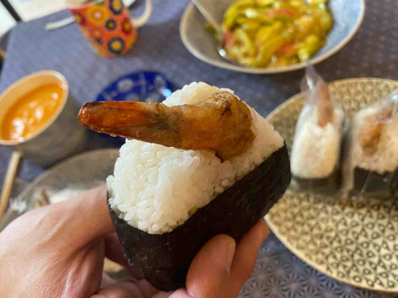 食べたのは海老の天むす。海老は名古屋の地雷也より大ぶりで、ぷりぷり、贅沢な感じです。海老天を天つゆに浸したお出汁がご飯によくしみしみしていました。