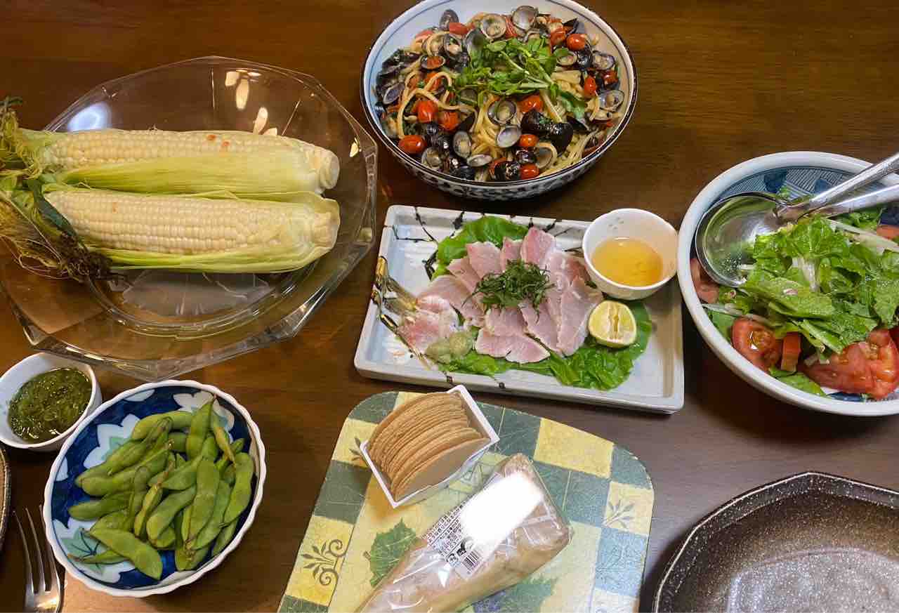 それからサラダ(日本のトマト、美味しい🥹)と、夫が買ったとうもろこし、そして賞味期限切れの恐ろしい値段のチーズ。