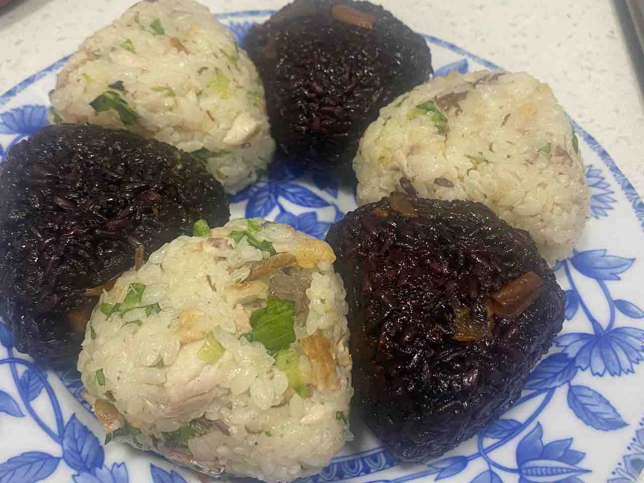 昼間にかぶり付く分と一緒に、マニプールの黒もち米も握りました☺️。白ごはんは、前日に残った鯖の切り身の混ぜご飯握り。天かす入りだからちょいとジャンキー😆。