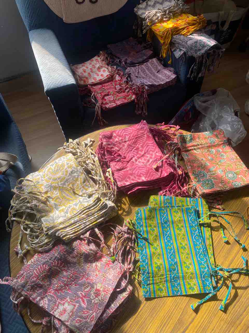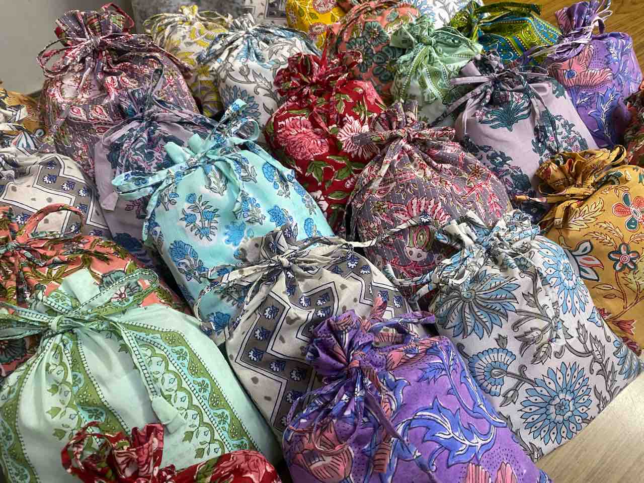 それを全く別の場所、「アーシャ・アジアの農民と歩む会」の自立支援の一環として、女性たちが縫っているのがブロックプリントの巾着。