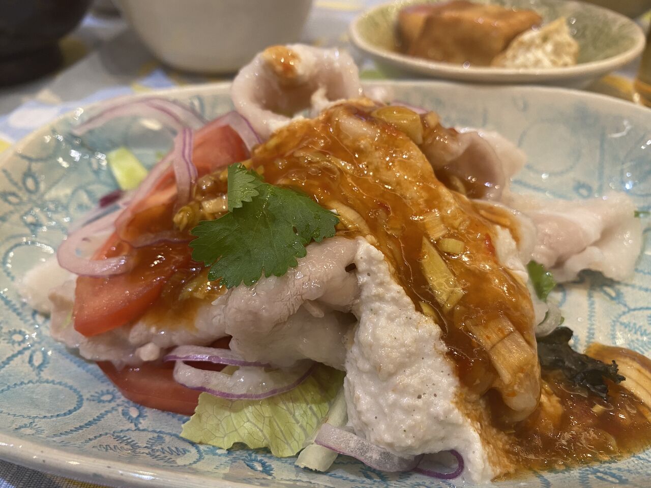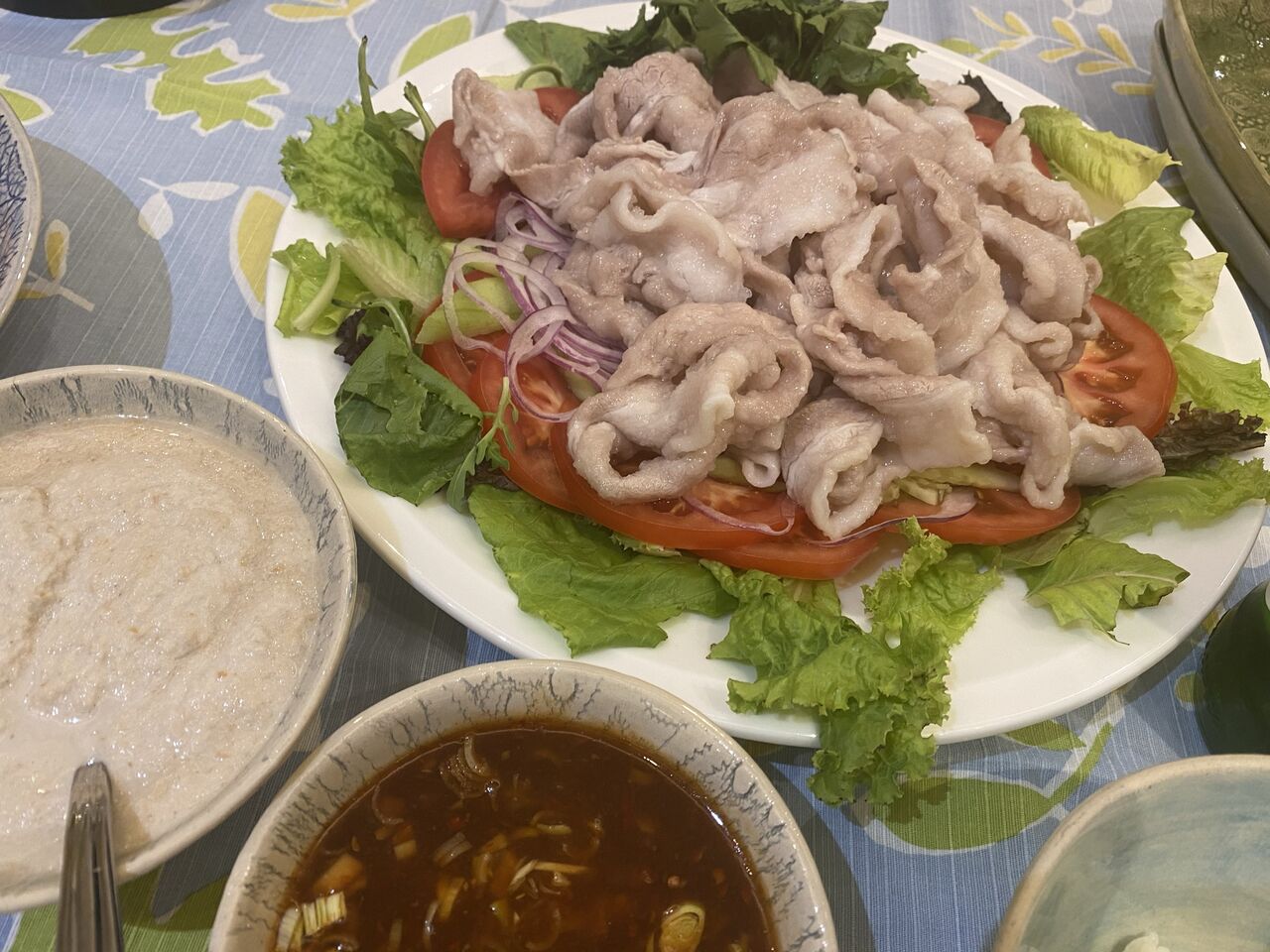 当時は豚肉が買えなかったので、既に良人がタイで大量に仕入れてきた冷凍豚肉を使いました。豚肉は片栗粉をはたいてからゆがき、氷水にさらすと、パサパサ肉も柔らかくなって、つるん😋。