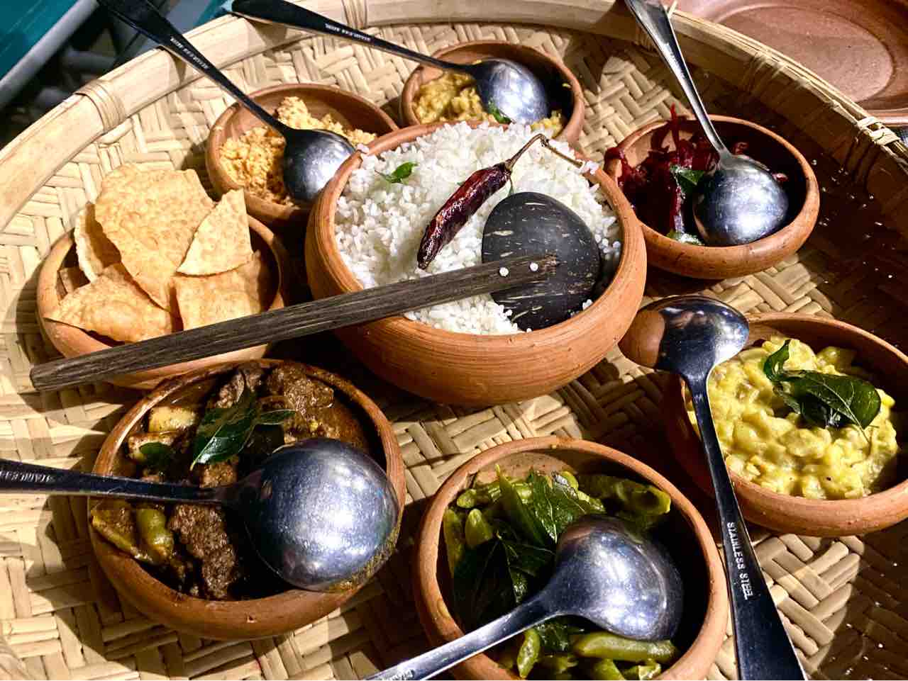 パラっとはしているけど弾力のあるご飯の周りには、ジャックフルーツカリー、ココナッツサムボル(ココナッツを使ったこじょっぱいお惣菜)、ビーツのお惣菜、インゲンのお惣菜、ダール、豚のカレーのボール。