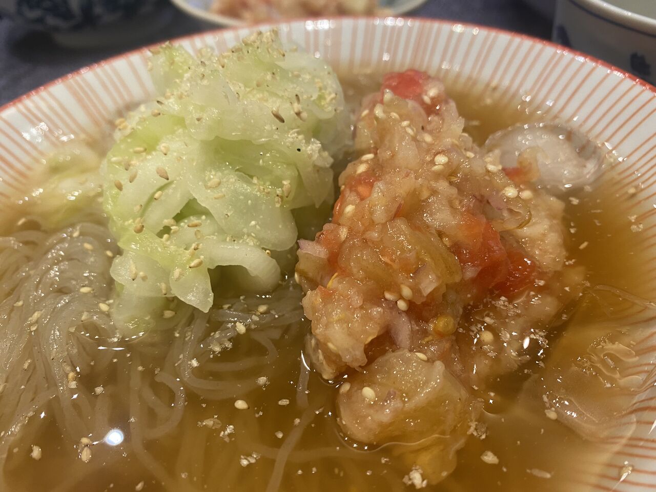 キムチ無し・あんまり辛くない・野菜シーチキン冷麺。