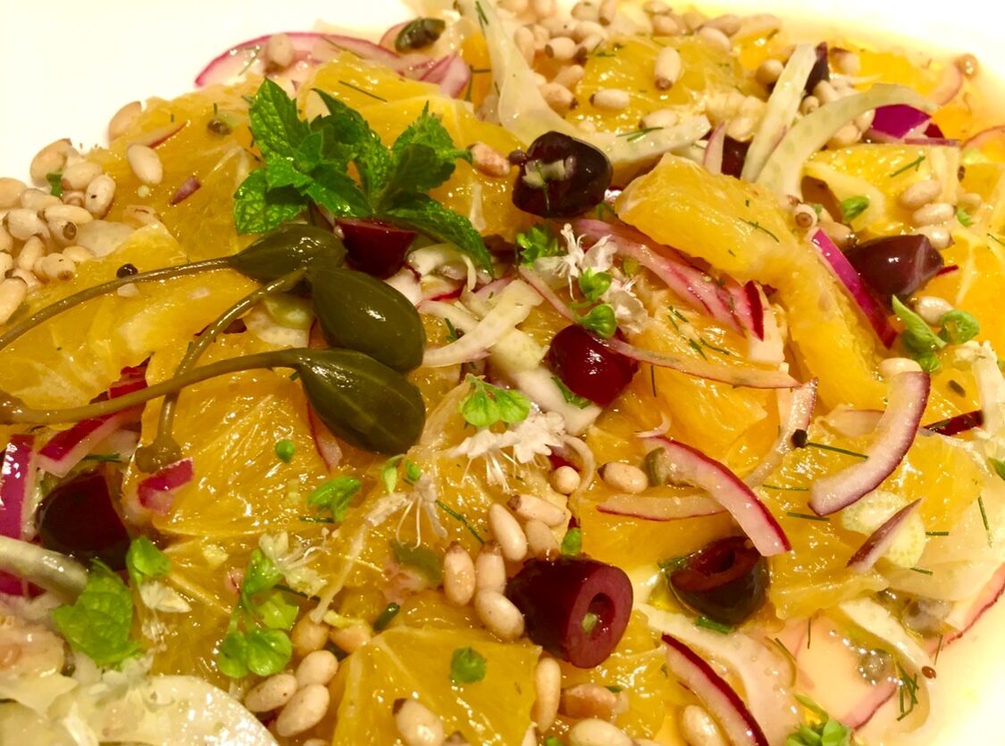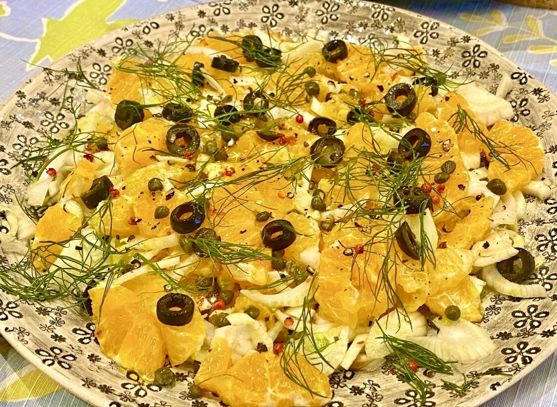 このサラダは、平たいお皿(ボール型器よりも食卓が華やぎます🥰)に、フェンネルとオレンジ、オリーブ、ケーパーを並べるだけで、味付けは、インドのレモン・ニンブーをぎゅぅっ、塩をパラパラ、最後にオリーブオイルです。