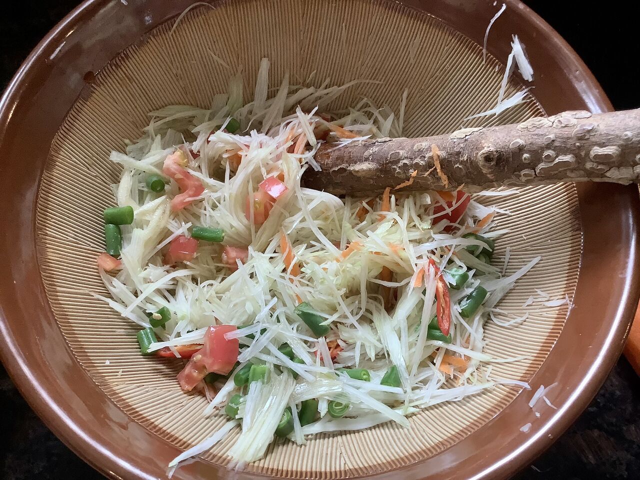 ソムタムを作るための器がないので、あたり鉢で代用。