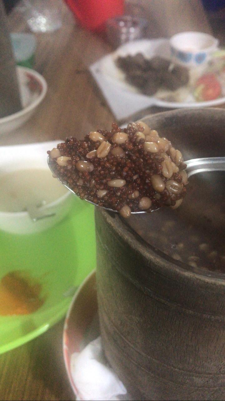 発酵乾燥菜と蕎麦の実で、いかにも胃腸お掃除スープ。お腹の調子は…快調です🙌。