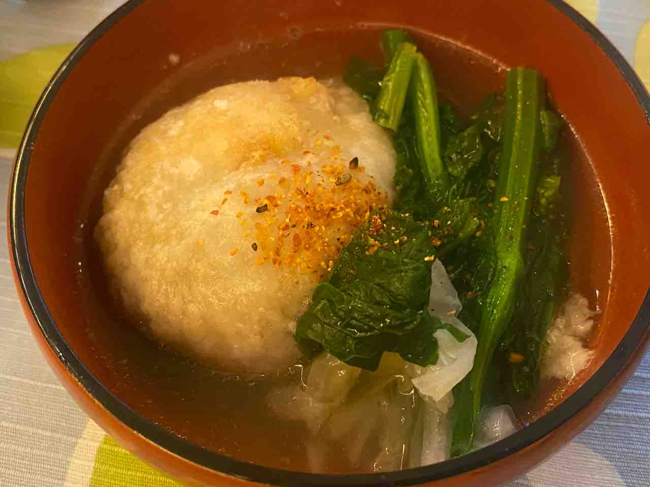 おつゆは、和出汁ベース、出張土産の菜花入り🥰。インドはすごく暮らしやすくなったと思っていたけど、インド近隣国の日本野菜、充実してますなぁ。