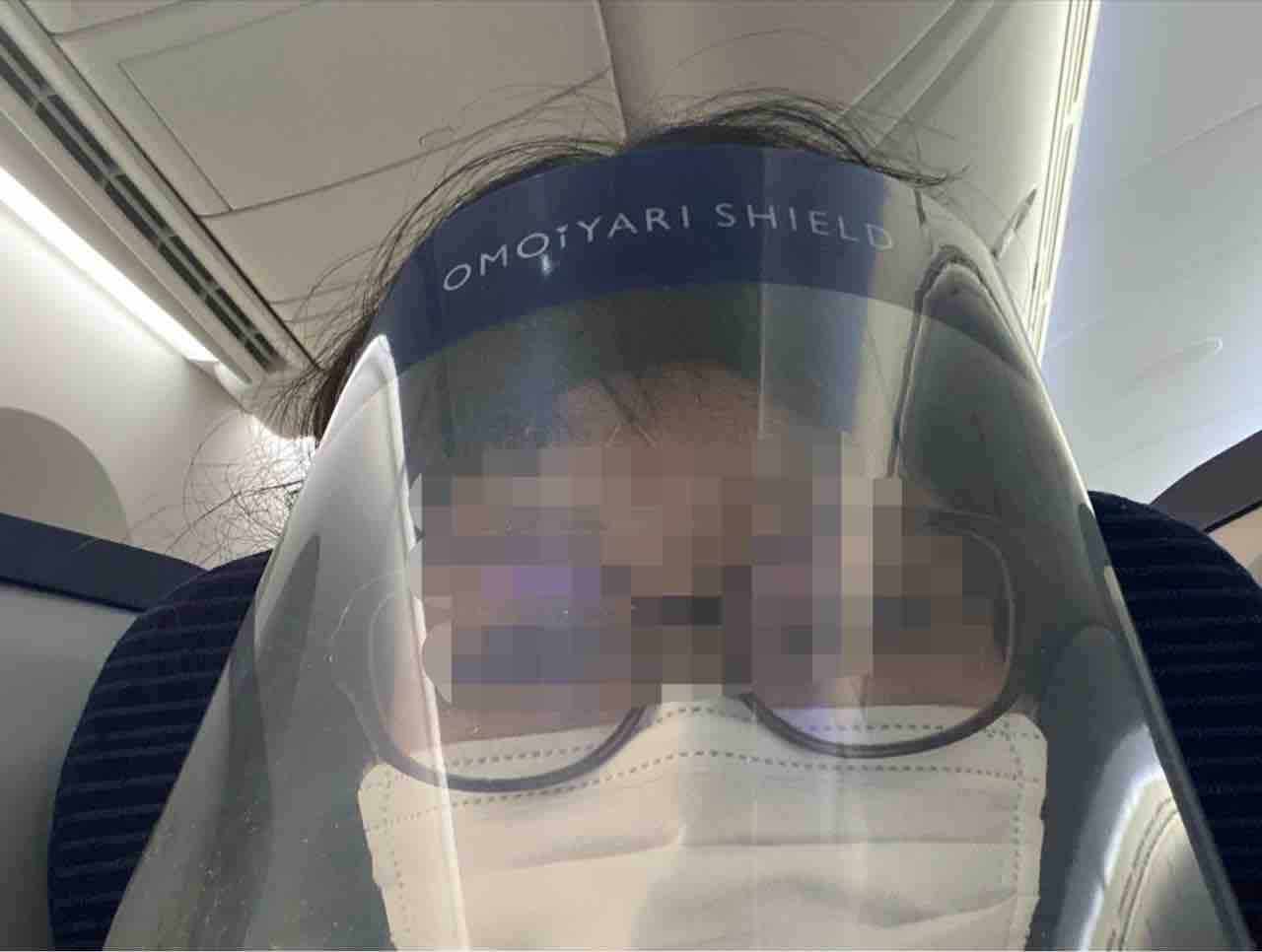 ↑飛行機到着後、扉が開くまで、ANAさんが準備してくださった「OMOIYARI SHIELD」をつけて、気合いを入れているところです(^^)。