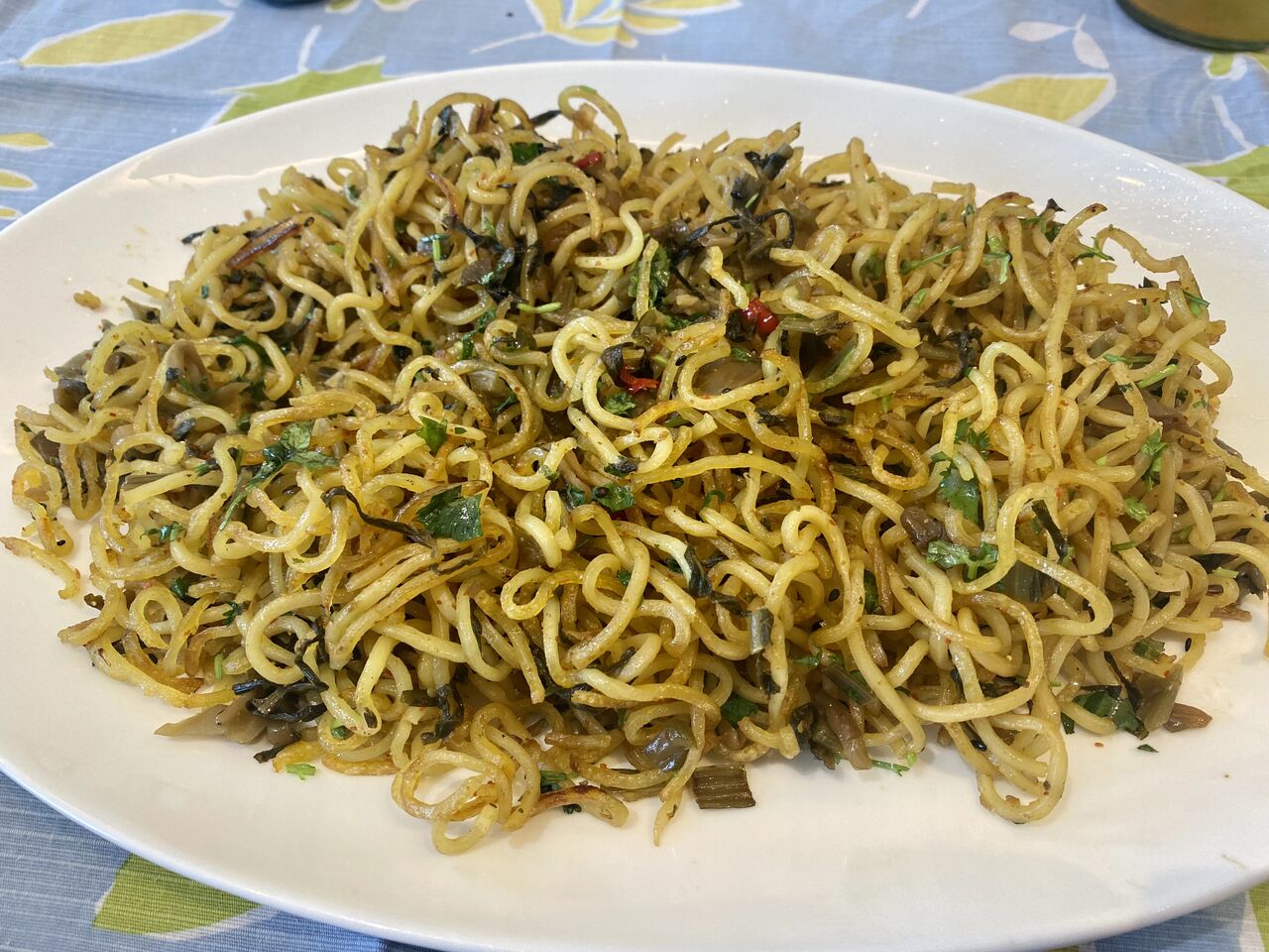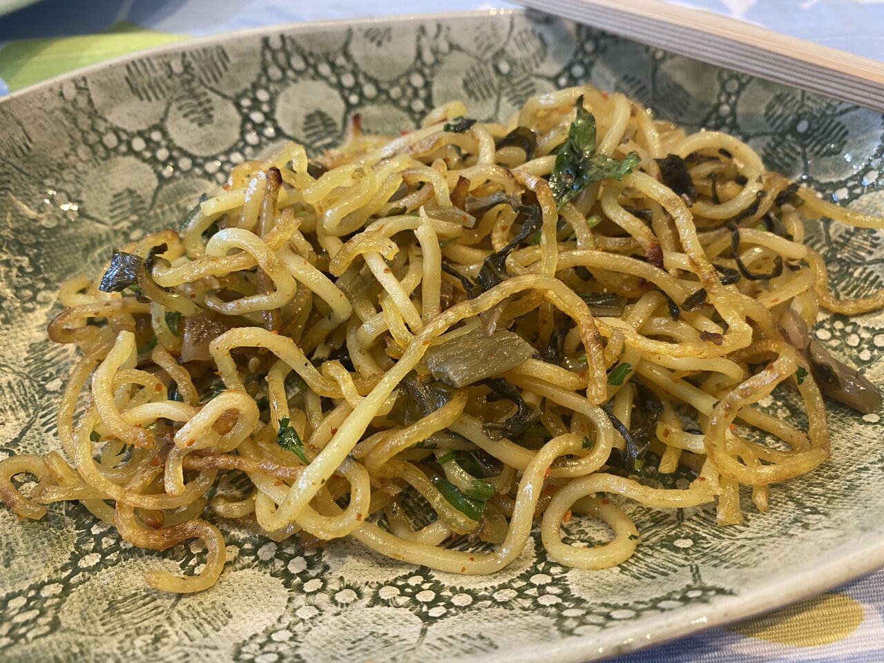 味付けは中華風。胡麻油を使って、微塵切りニンニク、塩、唐辛子、僅かに酢、で炒め、胡麻をパラパラ。