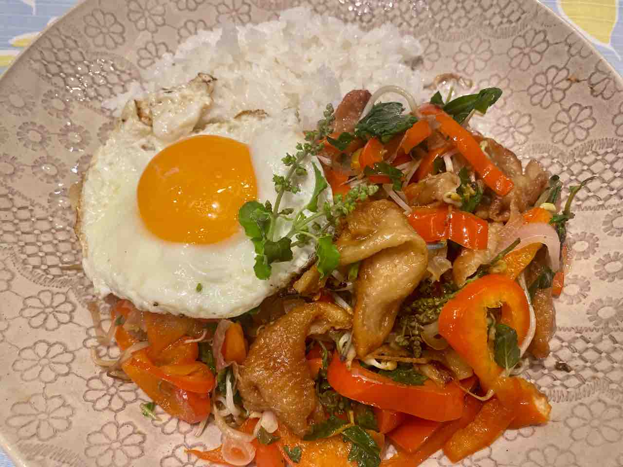ほぼ正常な生活形態になり、1人ごはんが増えそう☺️。色んなことがありすぎたけど、ここまでになってヨカッタ、ヨカッタ🥰。今回は、冷蔵庫にチョコチョコ残った余り物も一緒くたにして、炒めましたが、ふんだんに入れたホーリーバジル(インド名トゥルシー、タイ名ガパオ)の香りが、残り物感を一掃してくれました。強烈な暑さの中、次々に花芽をつけるトゥルシー。酷暑を乗り切るための生気をいっぱいもらえそうです。