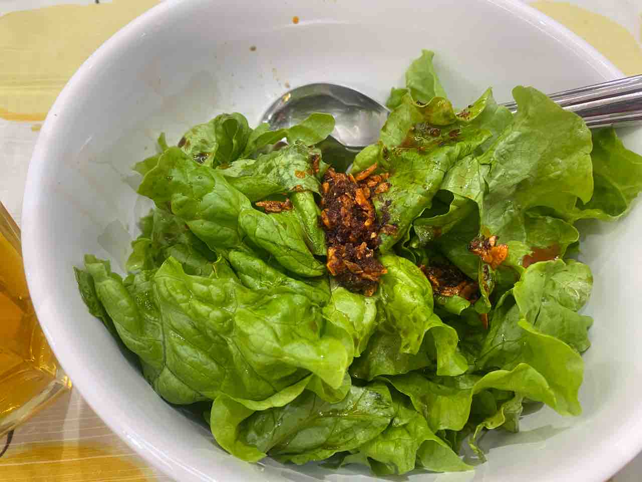 サラダはポン酢と食べるラー油。これも開けてしまった瓶詰めを使い切りたいからです。