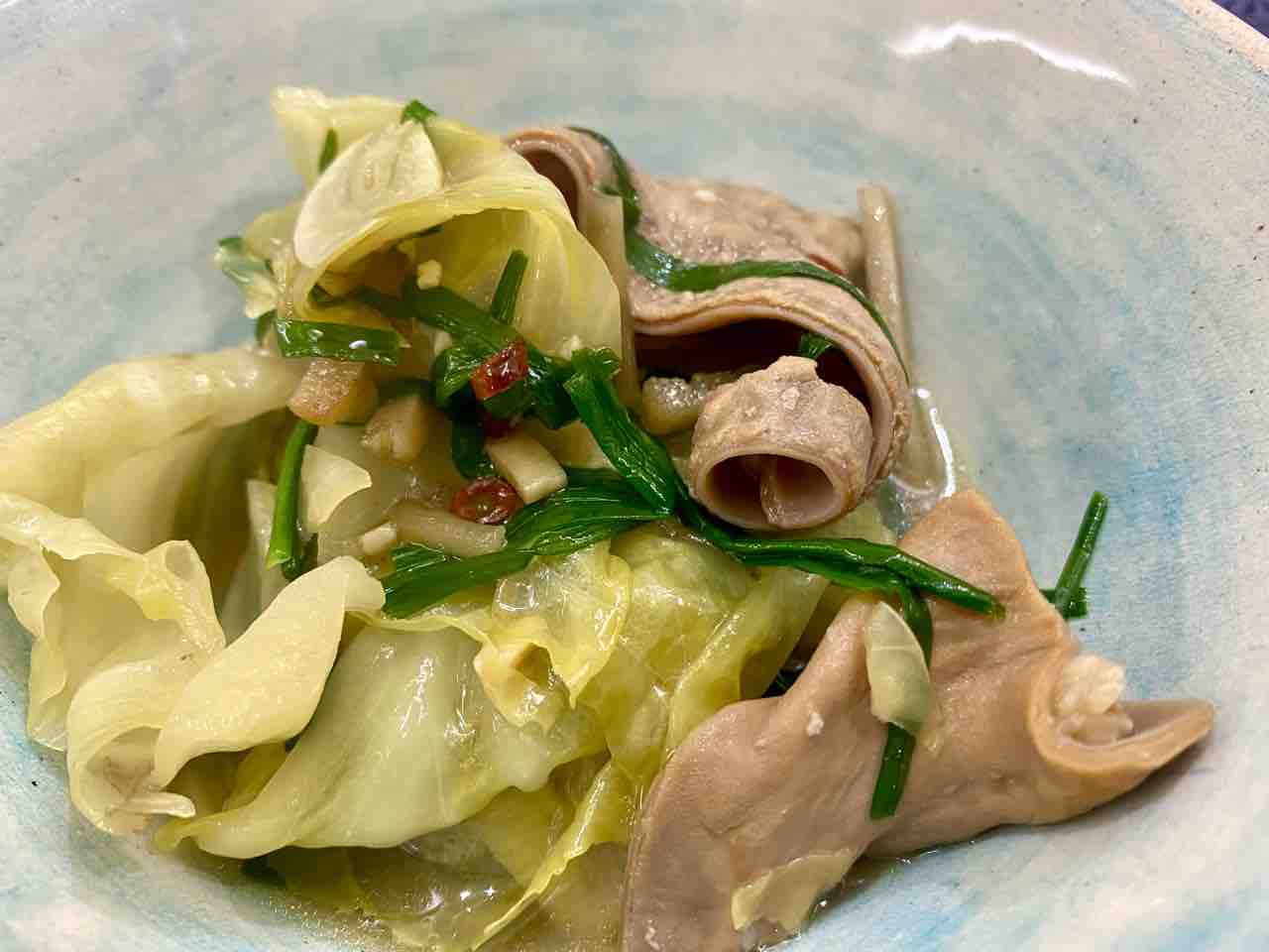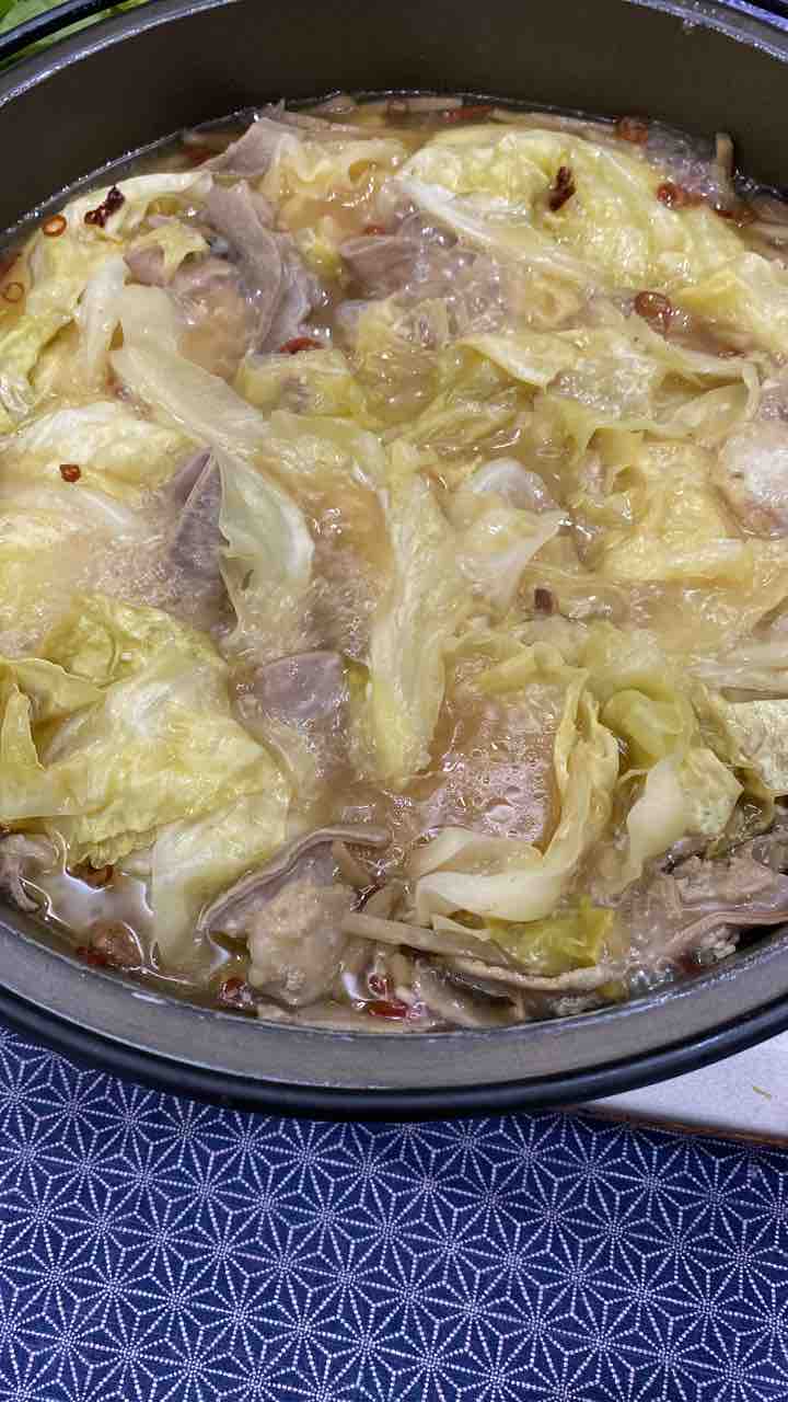 ウッタラ・キャベツとろんとろんになりました🥰。韮は、我が家産✨。そしてモツは一年前の持ち込み😅。でも、充分美味しかった~♪。