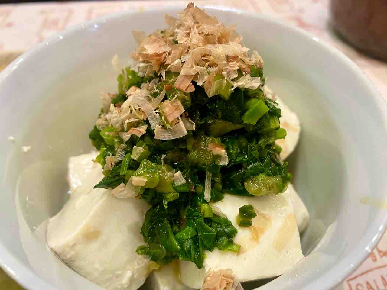 トマトさんのつるむらさきは、湯掻いて叩いて麺つゆワサビ味にして和えました。それを、水切りした元気豆腐さんの絹ごしに~♪。
