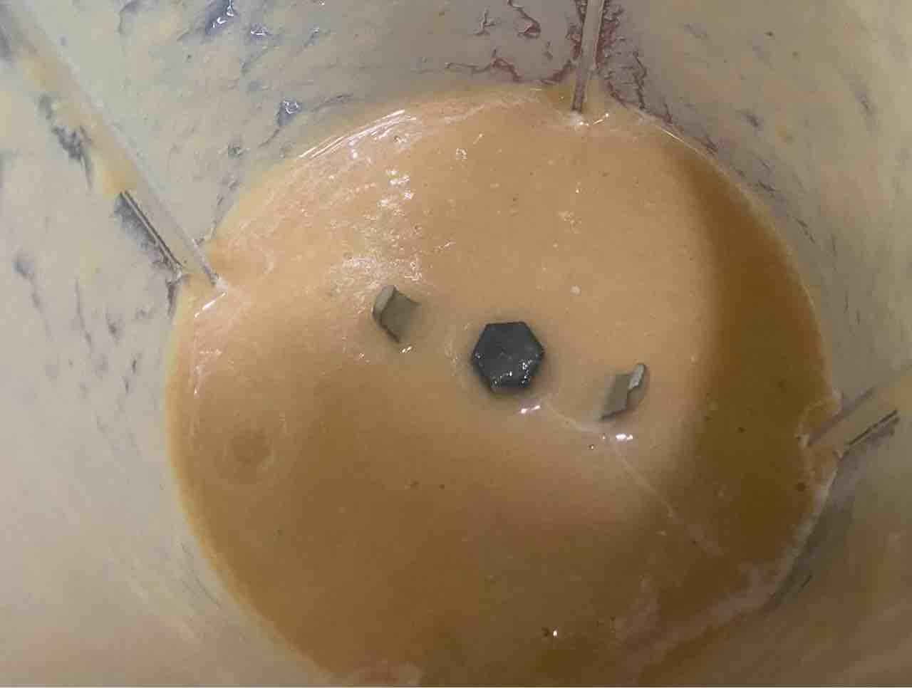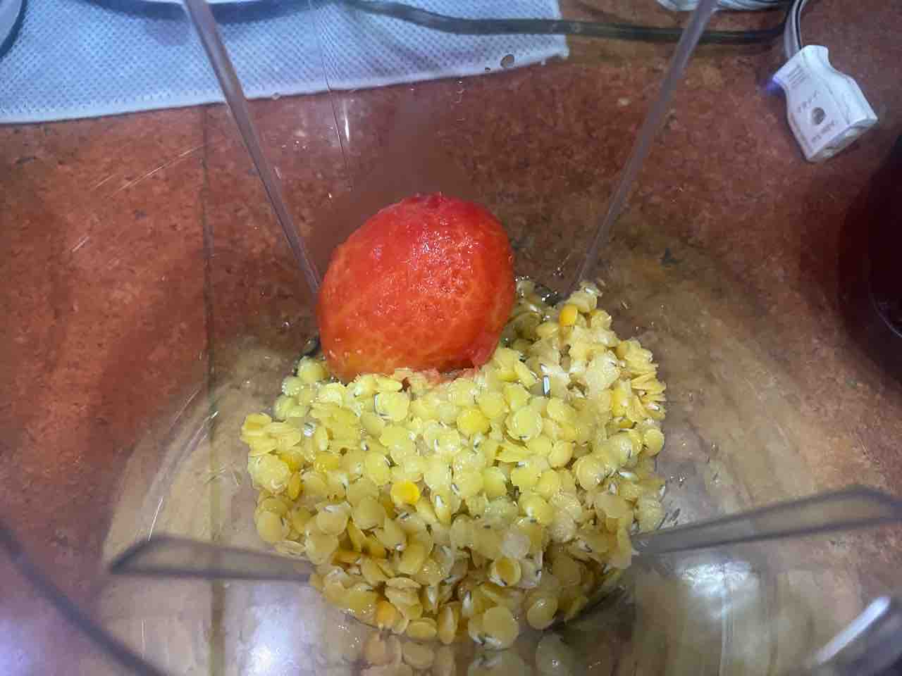 皮無し赤レンズ豆を茹で、白だしと冷水と一緒にミキサーにかけました。