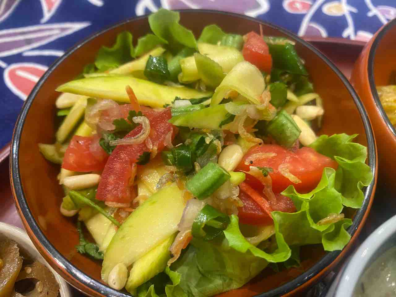 サイドのポテサラは、たくあんコリアンダー。紫玉ねぎも入った和印折衷ポテサラです😊。