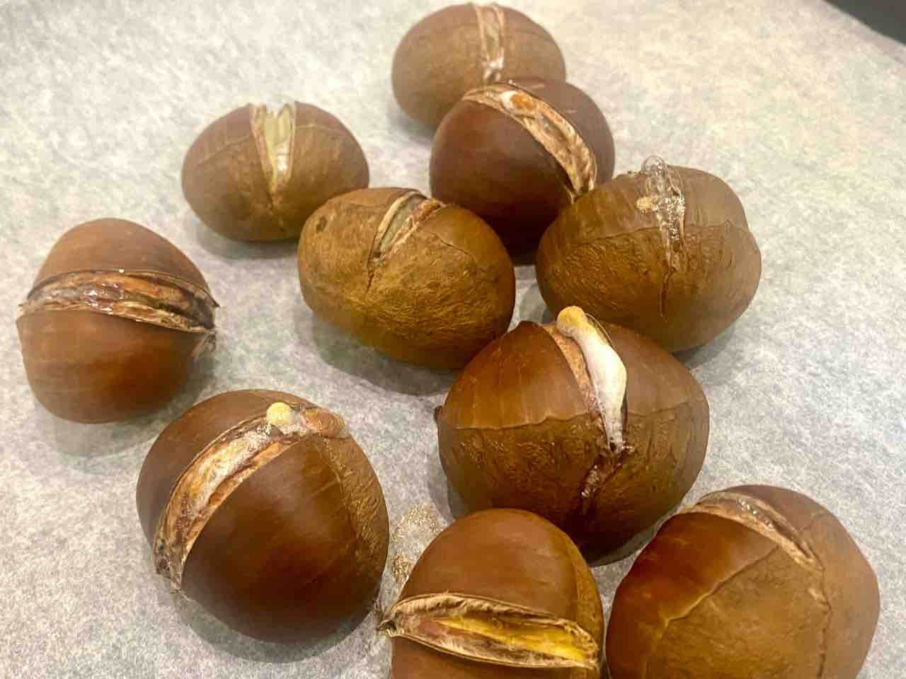 イタリアマンマに教わった、簡単オーブン焼き栗。ぷっくりした方に切れ目をいれ、200度20分。