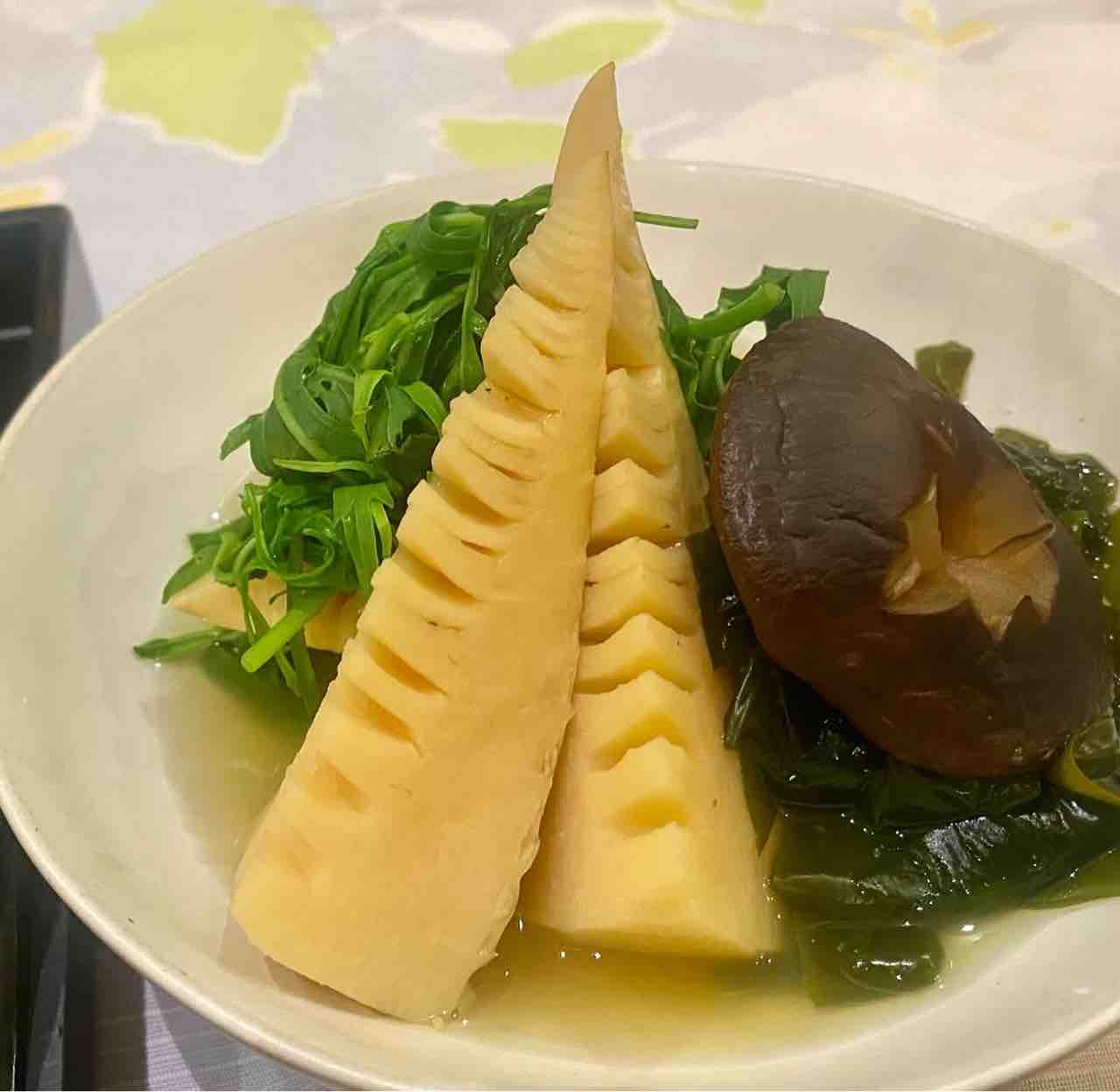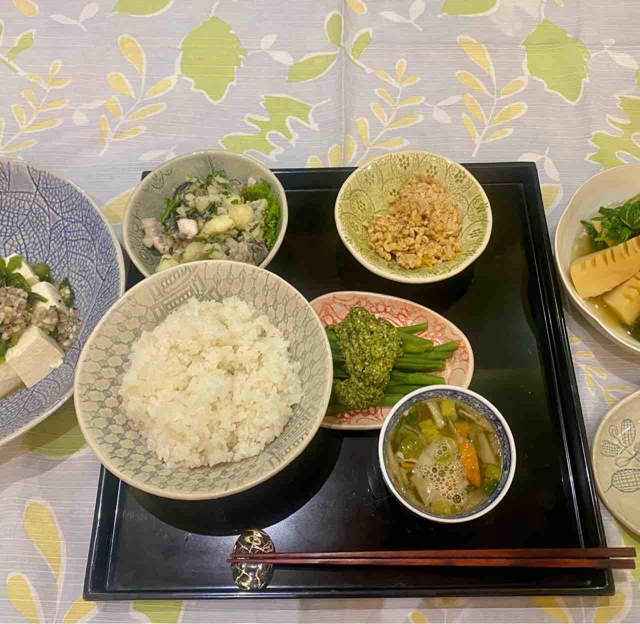 トマトさんのつるむらさきをわさび醤油和えにして、白だしで下味をつけたインド雑穀(蕎麦の実入り)をかけました。