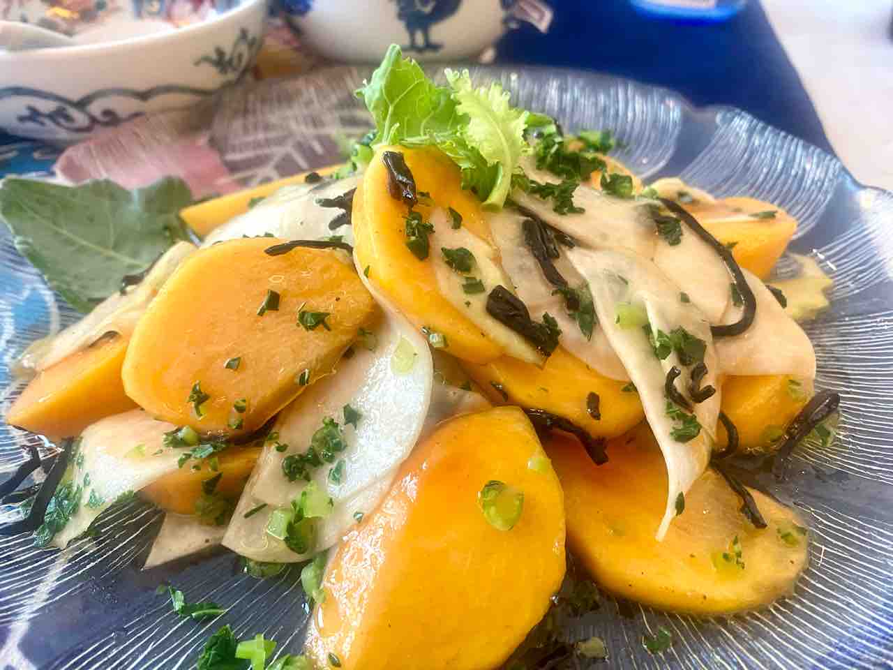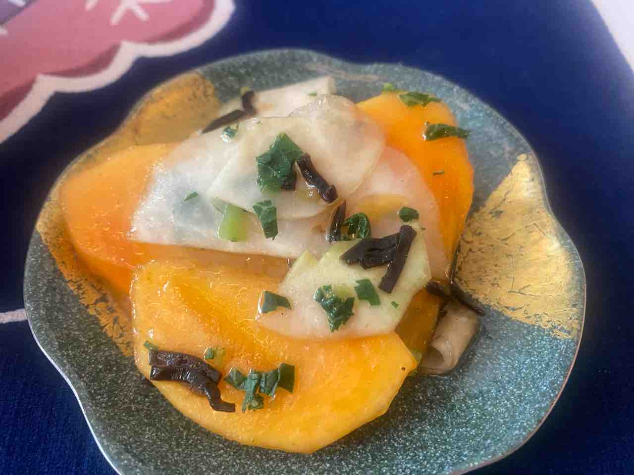 これから旬の、コールラビと柿と塩昆布とオリーブオイルで和えただけ~♪も美味しかった~☺️。