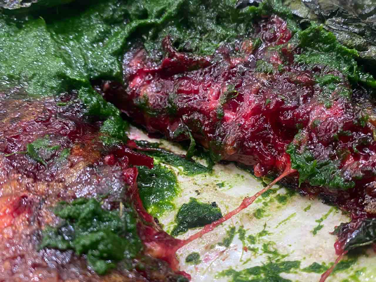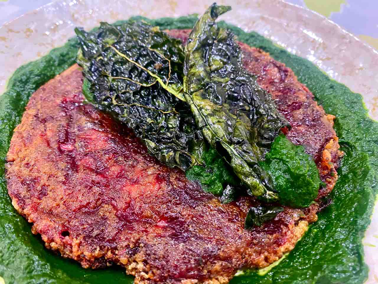 そして混ぜて焼くだけ。ソースはケールを使って。茹で揚げケールとコンソメスープと一緒にミキサーに。ペーストにすると綺麗な緑です。また、葉先を揚げたら、焼き海苔みたいにパリパリになりました。